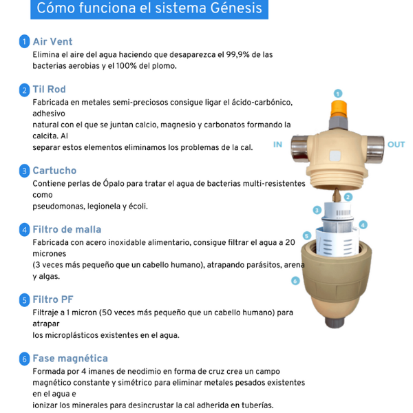 El Sistema Génesis es una solución ecológica no salina para eliminar la cal del agua sin cambiar su composición química. Funciona a través de procesos físicos y filtros avanzados que eliminan bacterias, metales pesados, y microplásticos. Entre sus beneficios, prolonga la vida útil de los electrodomésticos, reduce el uso de detergentes y productos químicos. Asimismo, es apto para el consumo humano y también para el riego de plantas.